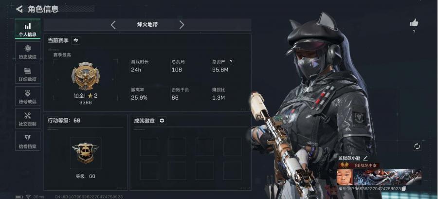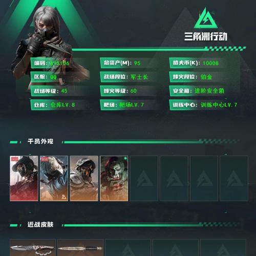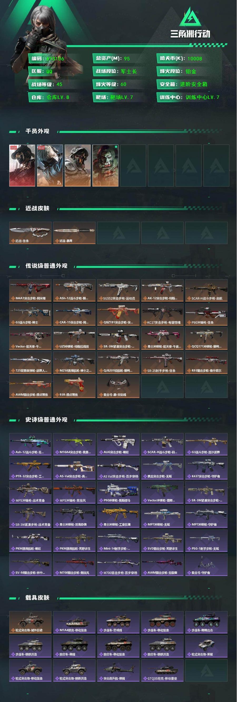 秒换绑 总资产95 10008k哈伏币-41m流动资产-60烽火等级-铂金-45战场等级-军士长 【干员外观】:露娜-黑·天际线,蜂医-送葬人·无题密令,深蓝-不破誓约,红狼-电锯惊魂 【近战皮肤】:近战-信条,近战-黑鹰 【传说外观】:M4A1突击步枪-阿米娅,ASh-12战斗步枪-鹅鸭杀,SG552突击步枪-运动员,AK-12突击步枪-特斯拉线圈,SCAR-H战斗步枪-启航,G3战斗步枪-骑士,CAR-15突击步枪-阿米娅,腾龙突击步枪-捞点薯条,KC17突击步枪-电锯惊魂,P90冲锋枪-信条,Vector冲锋枪-能天使-午夜邮差,UZI冲锋枪-特斯拉线圈,SR-3M紧凑突击步枪-特斯拉线圈,勇士冲锋枪-能天使-午夜邮差,QCQ171冲锋枪-鹅鸭杀,725双管霰弹枪-送葬人-无题密令,M250通用机枪-骑士之心,QJB201轻机枪-鹅鸭杀,SR-25射手步枪-信条,R93狙击步枪-维什戴尔,AWM狙击步枪-捞点薯条,93R-捞点薯条,复合弓-黑·天际线 【史诗外观】:ASh-12战斗步枪-无极限,M16A4突击步枪-竞赛选手,AUG突击步枪-蝮蛇,SCAR-H战斗步枪-囚徒,G3战斗步枪-流沙送葬,PTR-32突击步枪-工业狂潮,AS Val突击步枪-典狱官,AS Val突击步枪-百步穿杨,腾龙突击步枪-无垢,K437突击步枪-守护者,MP5冲锋枪-战术竞备,MP5冲锋枪-竞技风,P90冲锋枪-莫斯提马,Vector冲锋枪-猎鳄行动,SR-3M紧凑突击步枪-荒野求生,SR-3M紧凑突击步枪-战术竞备,勇士冲锋枪-深海恐惧,勇士冲锋枪-工业狂潮,MP7冲锋枪-无垢,MP7冲锋枪-守护者,PKM通用机枪-蝮蛇,PKM通用机枪-荒野求生,Mini-14射手步枪-守护者,SVD狙击步枪-荒野求生,PSG-1射手步枪-无垢,SV-98狙击步枪-林中猎手,M700狙击步枪-竞技风,M700狙击步枪-百步穿杨,AWM狙击步枪-无极限,复合弓-守护者 【稀有外观】:AKM突击步枪-战术演练,AKM突击步枪-肃杀,QBZ95-1突击步枪-公平竞技,ASh-12战斗步枪-繁盛,K416突击步枪-虎啸,M7战斗步枪-精英联盟,M7战斗步枪-捣蛋鬼,SCAR-H战斗步枪-荣耀列队,SCAR-H战斗步枪-黄昏,G3战斗步枪-战术演练,G3战斗步枪-主宰,腾龙突击步枪-雪崩,腾龙突击步枪